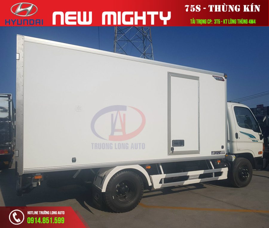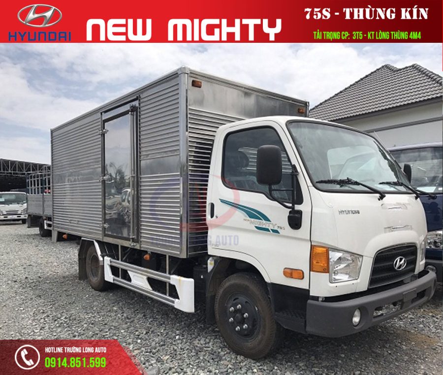 Xe tải Hyundai New Mighty 75S 3 tấn 5 Thùng kín là dòng sản phẩm phù hợp với nhu cầu khách hàng cần chở khối lượng hàng hóa nhiều nhưng có bằng B2, với kích thước chiều dài thùng 4,4 m, tải trọng 3,495 kg. Xe Tải Hyundai New Mighty 75S Thùng kín với những ưu điểm về mặt tiết kiệm nhiên liên , động cơ mạnh mẽ thân thiện môi trường. Trường Long Auto chuyên cung cấp xe tải Hyundai New Mighty 75s hàng đầu Việt Nam.